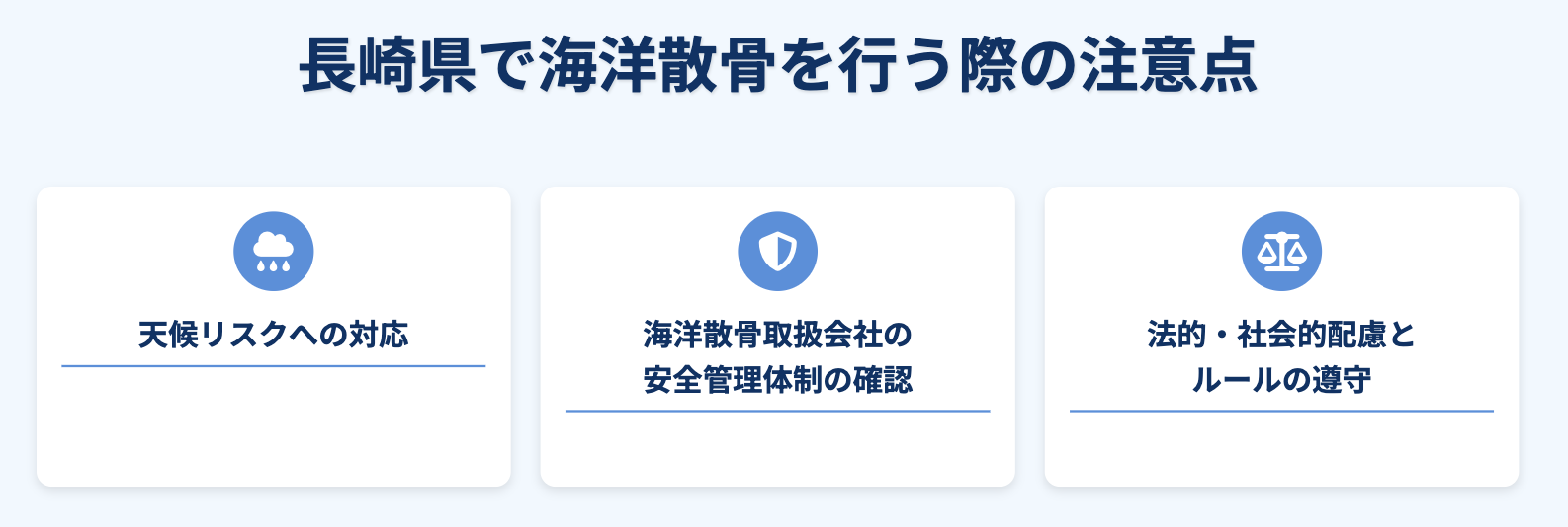 海洋散骨を行う際には、各地方自治体が定める海洋散骨に関する規定や、ご遺骨の取り扱いに関する関連法令に基づく節度ある方法を守る必要があるほか、天候や安全面についても十分な注意が求められます。