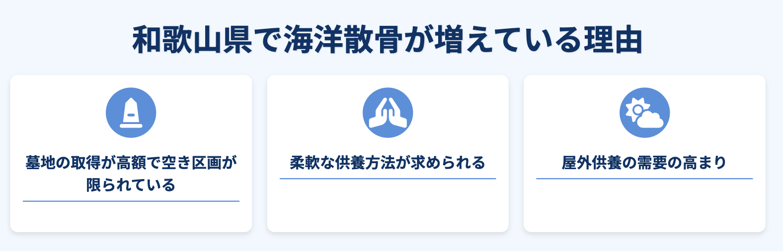 和歌山県は、都市部・地方部問わず、墓地の取得が高額であることや空き区画が限られているため、従来のお墓を維持するのが難しい現状があります。さらに、少子高齢化が進む中で、従来の形式に囚われない柔軟な供養方法が求められるようになりました。
